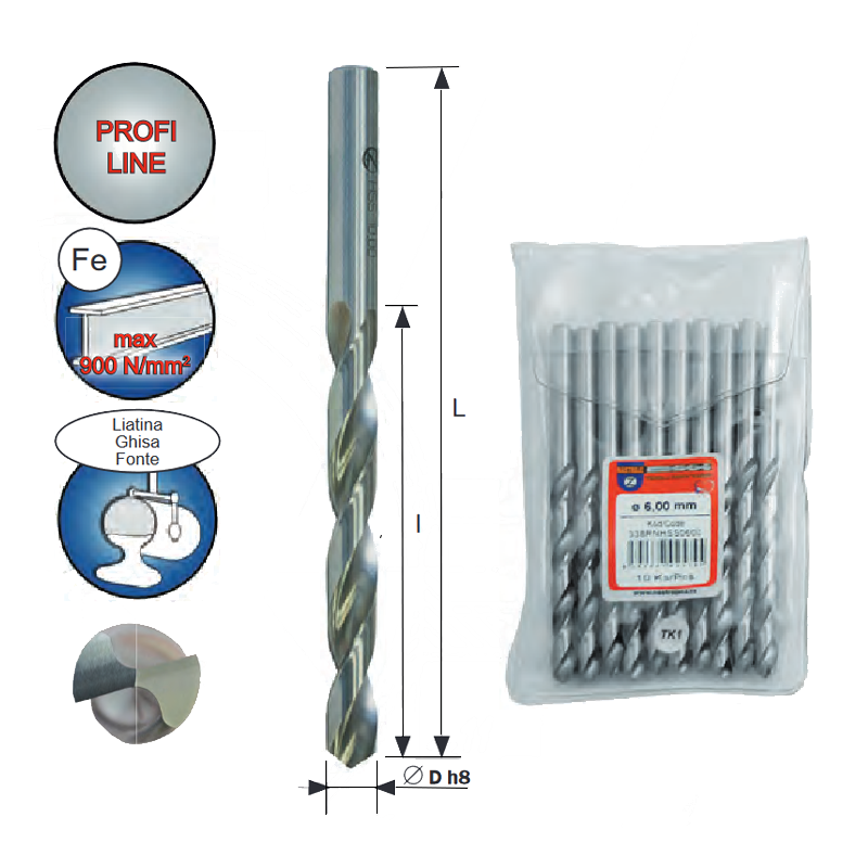 Výkonný vybrusovaný vrták odporúčaný na vŕtanie v súčiastkach z nelegovanej i legovanej ocele, oceľoliatiny do pevnosti 900 N/mm2, šedej temperovanej i tvárnej liatiny, spekanej ocele, hliníkovej zliatiny s krátkou trieskou, bronzu. Vyrobené podľa normy DIN 338 a PN2913 z materiálu HSS, Profi Line. Typ šróubovice "N" – uhol stúpania 25-30°, uhol špičky 118°. Priemer: 0,80 mm Dĺžka L: 30 mm Ďĺžka l: 10 mm Balenie: 10 ks